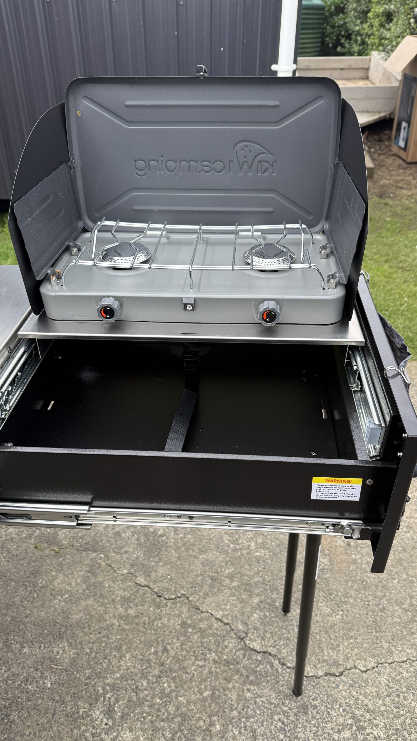 • ausziehbare Küche mit zweiflammigem Gaskocher und integriertem Spülbecken
