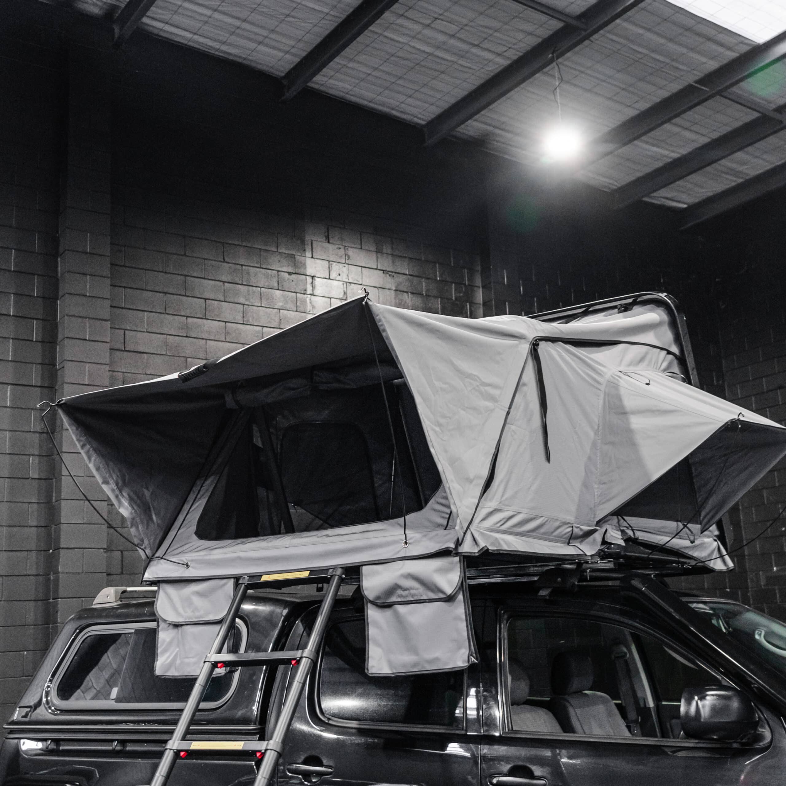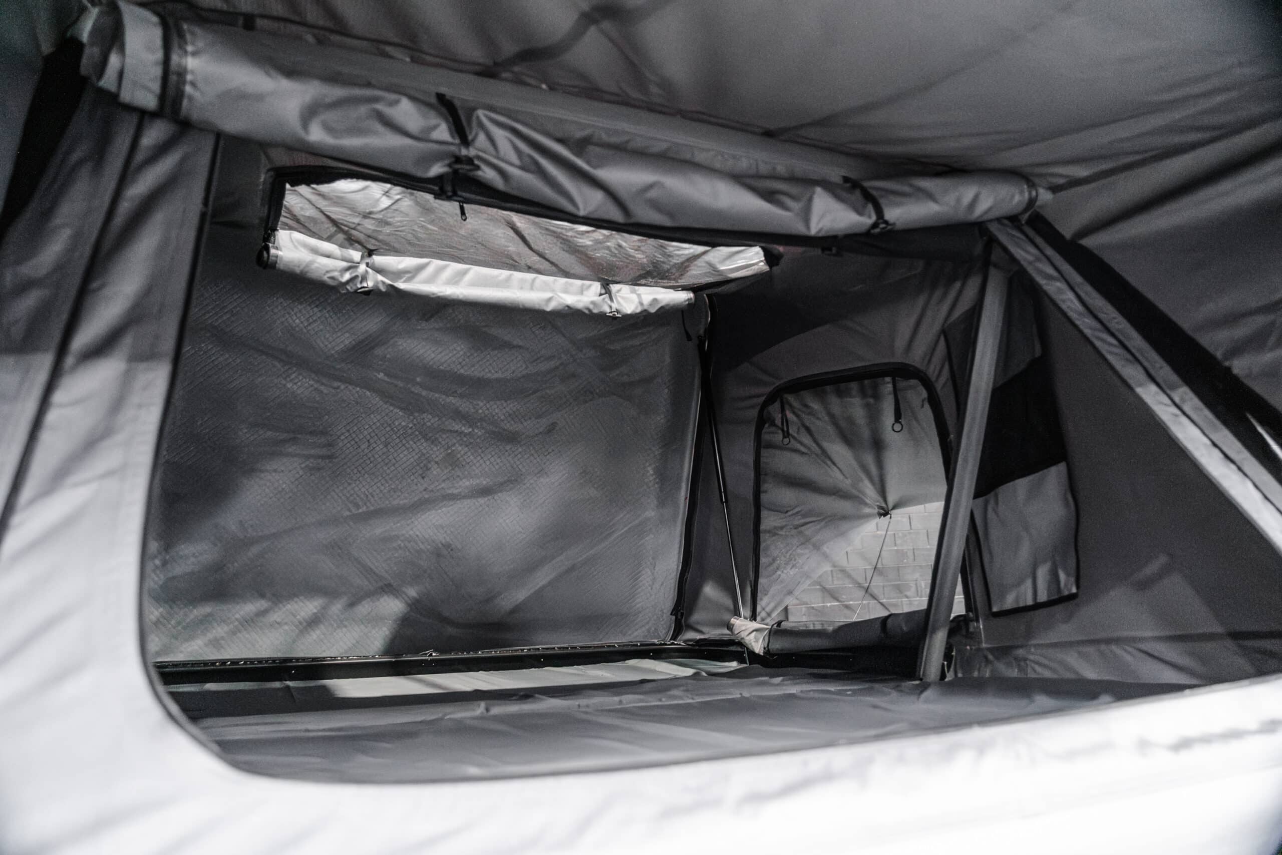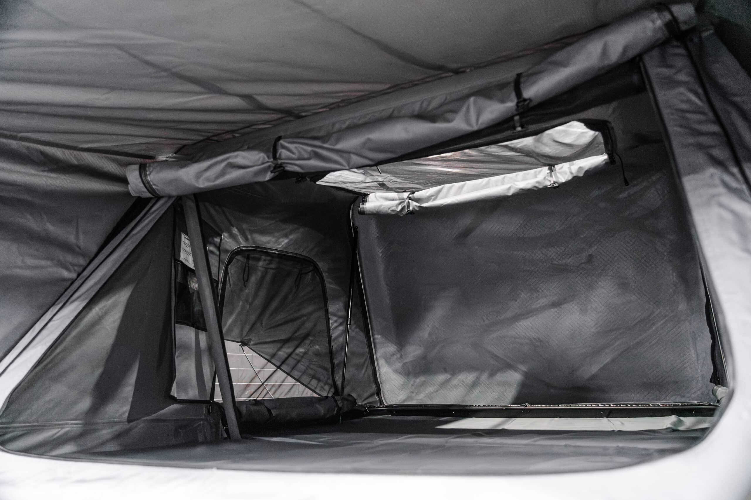 • Defender Off-Road Cantilever Hardshell Dachzelt: Schnell aufbaubares Dachzelt mit Insektenschutz, Dachfenster, LED-Beleuchtung und hochdichter Matratze – Schlafplätze für 2 Erwachsene + 1 Kind (ca. 215 cm x 165 cm)
